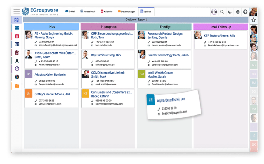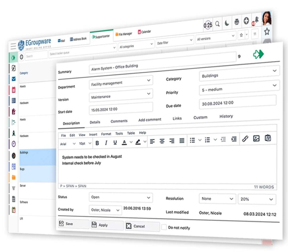 With the ticket system, EGroupware offers you a flexible module for recording internal or external support cases. Convert emails into a ticket with one click or use automation functions for this. In addition, you can also use it as a service module or forum replacement.