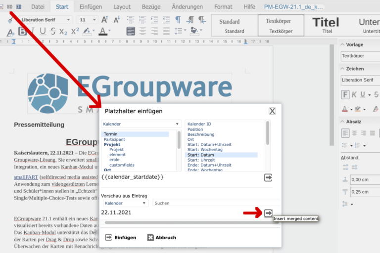 Wie Sie Platzhalter und automatische Generierung von PDF/PNG in EGroupware und Collabora online Office nutzen können