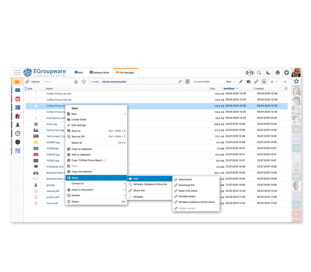 The EGroupware file manager helps you to structure your files in the company and to include external partners. Especially in times of home office and working at different locations.