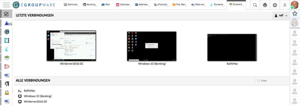 Le nouveau module « Guacamole » permet de créer un véritable bureau à domicile en accédant au PC de l’entreprise via un navigateur web. Les applications complexes peuvent être transférées vers le navigateur des PC plus faibles et y être utilisées. Cela élimine également les problèmes de coûts de licence pour les applications spécialisées sur les PC locaux du bureau à domicile.
